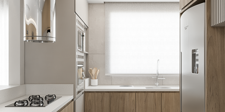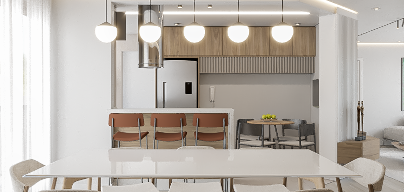 As cores claras se complementam com o tom amadeirado, criando um ar de sofisticação que abraça os usuários.
